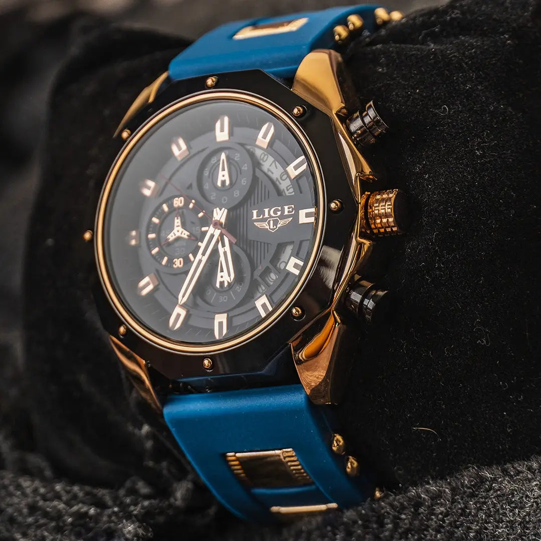 Crafted with meticulous attention to detail, our watch boasts an exceptional blend of high-quality materials that exude an air of opulence. The sleek silhouette is adorned with a lustrous silicone band, perfectly complementing the robust stainless steel case. At just 12mm thick, the case embraces your wrist with a subtle grace, while the 46mm dial diameter